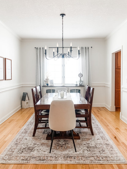 I never thought I'd enjoy having a formal dining room as much as I have. I honestly looked right past it while touring the house. But hosting family and friends has always been one of my favorite things to do. And having the extra space to get everyone sitting down on a real dining surface has been great when we have the whole family over. We painted trim and walls, added a more modern chandelier, added window treatments. We were able to use all existing furniture in here but created new wall decor - including probably the best idea I've ever had - making prints out of handwritten family recipes.